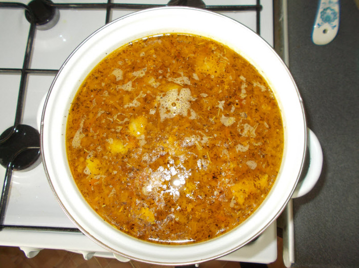 Закидываем в получившийся бульон картошку и обжареный лук с морковкой, солим по вкусу и после закипания, опять убираем кастрюлю на самый медленный огонь.