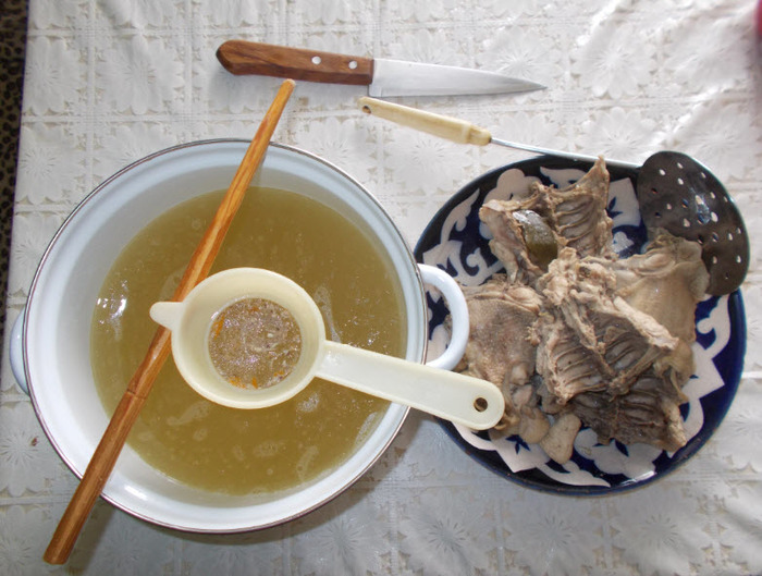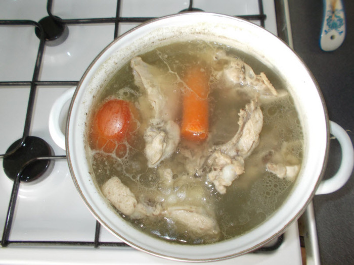 Снимаем кастрюлю с плиты, вылавливаем из неё всё что не является бульоном.