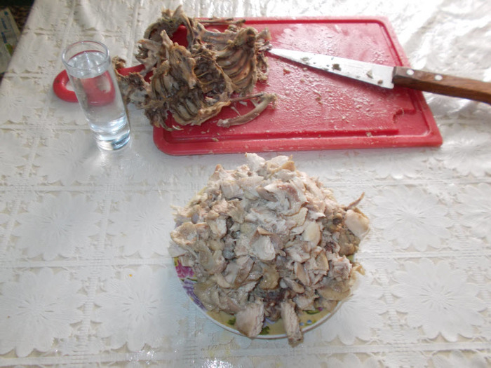 Размораживаем спинки и тщательно их моем, вымывая из рёбер остатки легких и крови. Для себя же готовим.