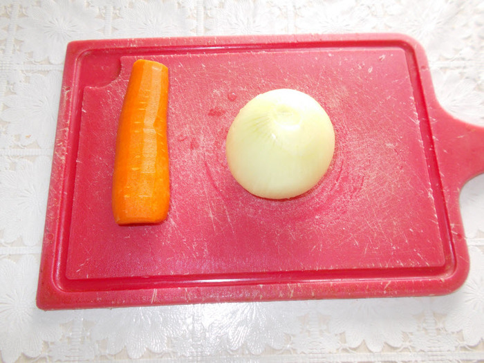 За это время, пока варится бульон, мы спокойно, без спешки, успеваем перемыть всю посуду, которая со вчерашнего дня в раковине лежит. Почистить морковку и лук.