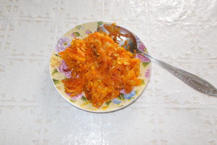 Короче, не буду спорить, я вашим кулинарным феншуям не обученый, обжаривайте как хотите. Я обжаривал лук с морковкой вместе. Получилось вот так.