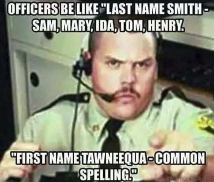 На меме изображён диспетчер, слушающий офицера. Было написано: «Это офицер по фамилии Смит (Smith). Диктую по буквам: Сэм, Мэри, Ида, Том, Генри. Имя – Таункуо, пиши, как обычно». Проблема была в имени Таункуо, которое более распространено среди афроамериканцев.