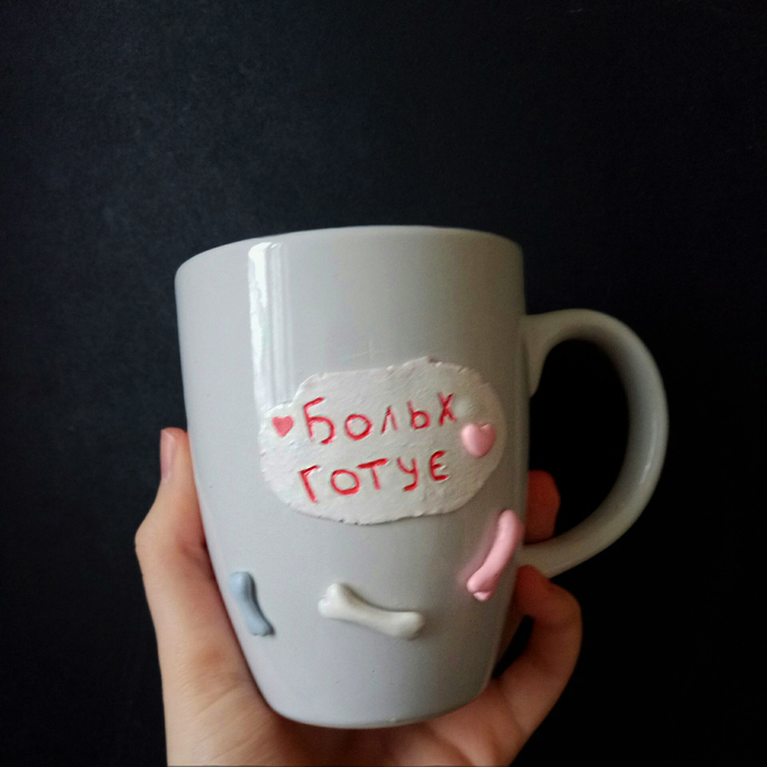 с другой стороны на чашке надпись на украинском "Больх готує (готовит)", что является локальным мемом для повара и его товарищей
