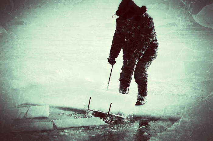 Сам процесс происходил следующим образом: дедушка долго подбирал чистое место без всяких грязных следов (я конечно же помогал выбирать), он смел снег со льда, пробурил одну или две дырки во льду при помощи ручного бура (который он всё это время тащил за спиной). Затем, самым обычным топориком, он начал отрубать довольно большие куски льда, а я наблюдал за тем, как он не без труда вытаскивал льдины наверх и затем загружал в сани.