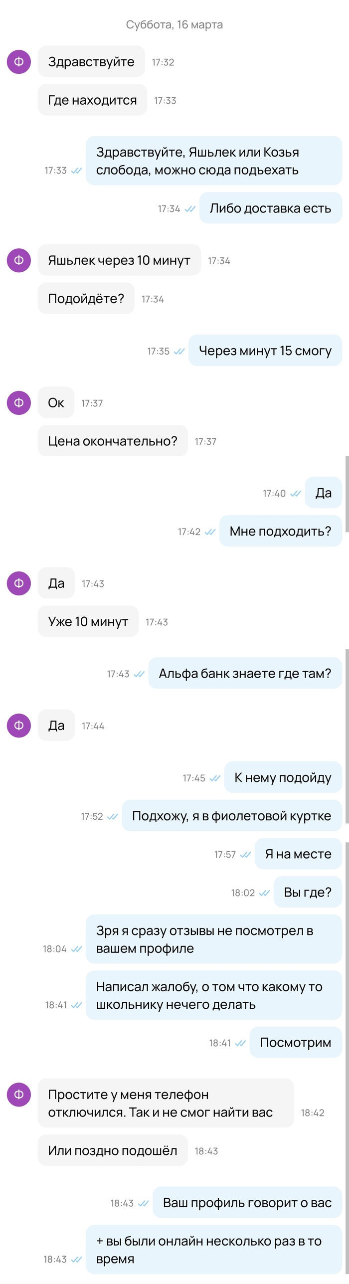 @Avito.help долго этот человек будет троллить продавцов и других пользователей? К слову рейтинг у него 3.9, чел просто сидит и по приколу тратит время людей! А если бы Я не пришел, то у меня бы сейчас красовалась заслуженная 1 звезда в отзывах! Выкладываю переписку и отзывы в его профиле.