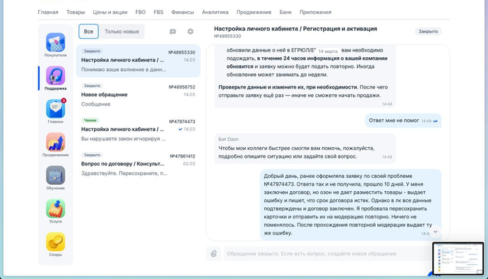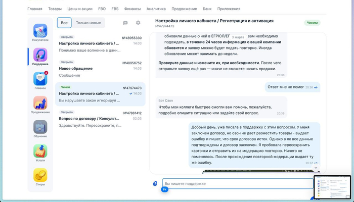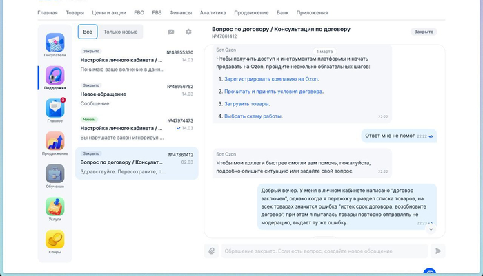 Сразу после заключения договора с Ozon в личном кабинете и размещения карточек товаров появилась ошибка: «Истёк срока действия договора». Она коснулась всех карточек и не даёт пройти модерацию ни одной, что очень странно, поскольку проверка документов пройдена и договор заключен ну вот только что. Уже месяц пытаюсь решить эту проблему через техподдержку, но ответы либо шаблонные от ботов, либо вовсе не помогают. Я пересохраняла карточки товаров, отправлял их на повторную модерацию — безрезультатно. Ошибка остается неизменной и не позволяет начать продавать.
