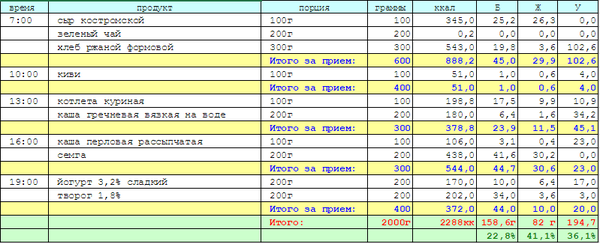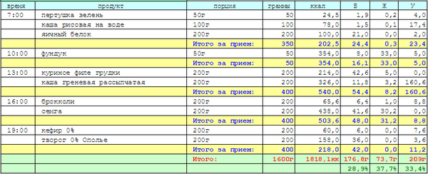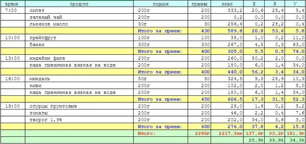 Ниже выкладываю примерную схему моего питания на данный момент, она универсальна хотите похудеть меньше углей. Набрать - больше белка. Выкладываю по дням, соответственно первый, второй, третий и четвертый дни, потом повторить.