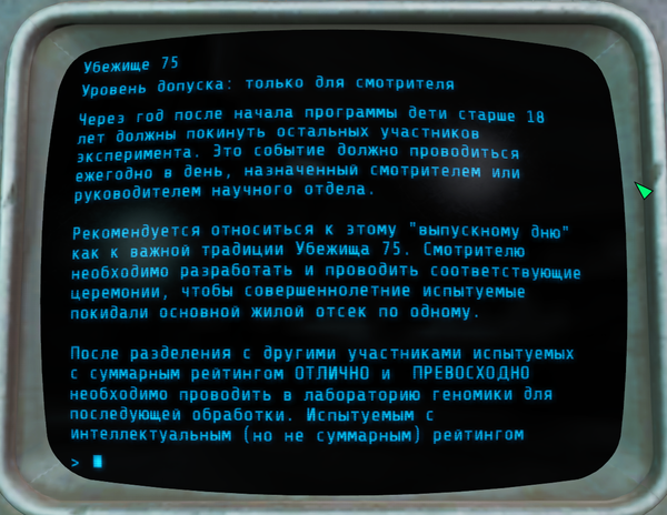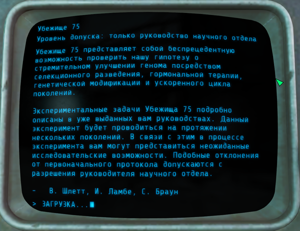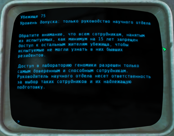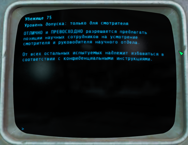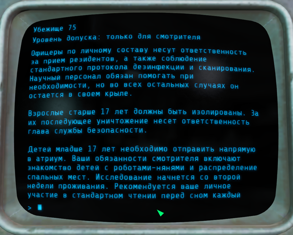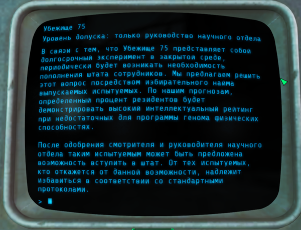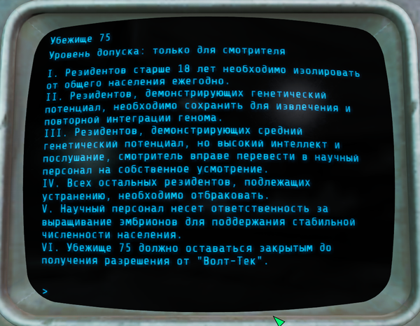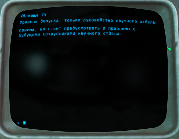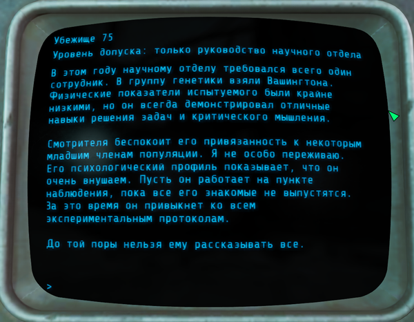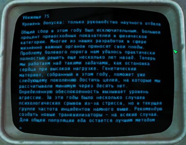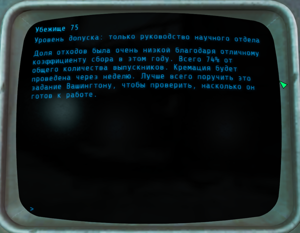 На этом терминалы в убежище 75 закончились. Вот такая печальная история убежища 75. Не очень понятно, зачем они убивали(мне не понятно) . Но в итоге всё убежище пошло под откос.