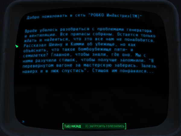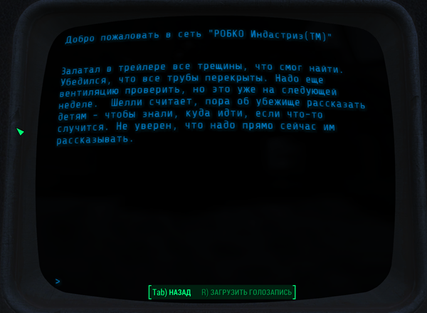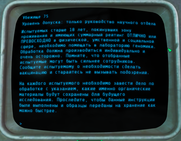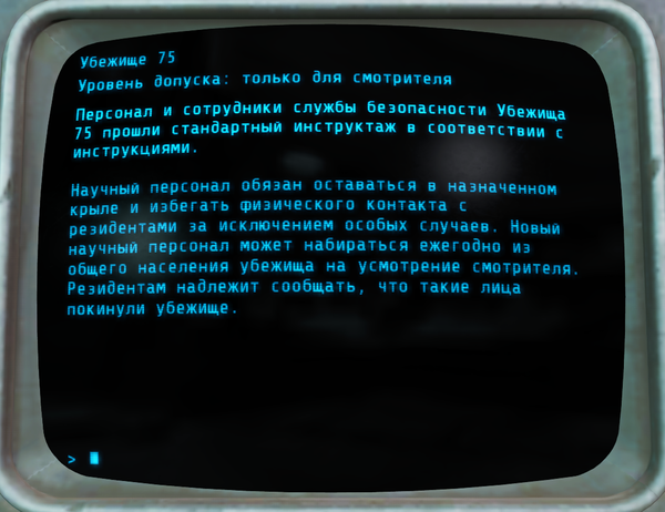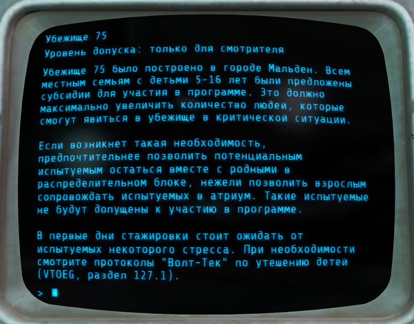 Всем доброго времени суток. Это вторая часть про убежище 75, в прошлой части http://pikabu.ru/story/fallout_4__ubezhishche_75_4991969 я выложил истории терминалов и строение убежища. Сегодня будет вторая часть историй.