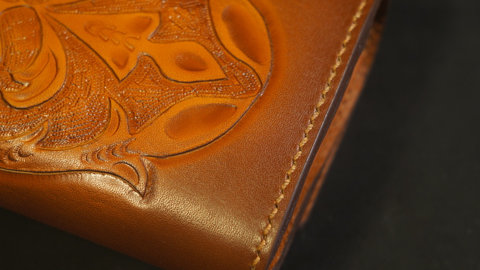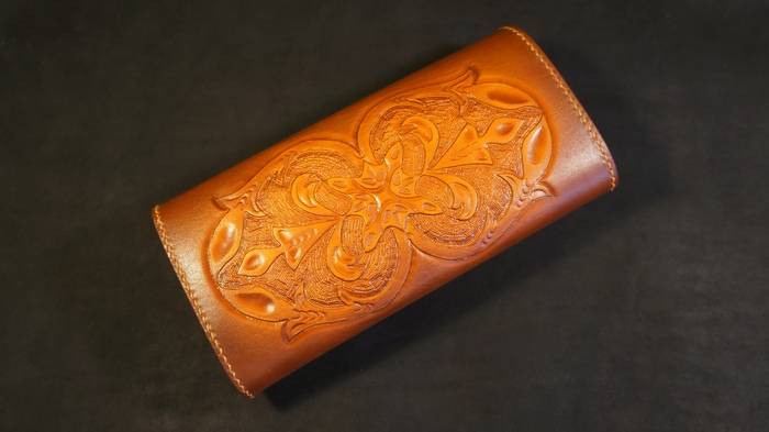 Дизайн разрабатывал сам, используя мотивы ренессанса, симметрия и некоторая пышность форм. Если покопаться в постах, можно найти подобный кошелёк сделанный пару лет назад. Жаль, на пикабушке посты удалять нельзя). Тем не менее, заказчица просила рисунок как там.