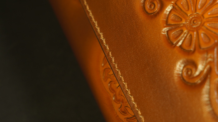 Итак, на обложке кожа коровы растительного дубления, нанесён рисунок в технике холодного тиснения, окрашен аэрографом и покрыт глянцевым лаком.