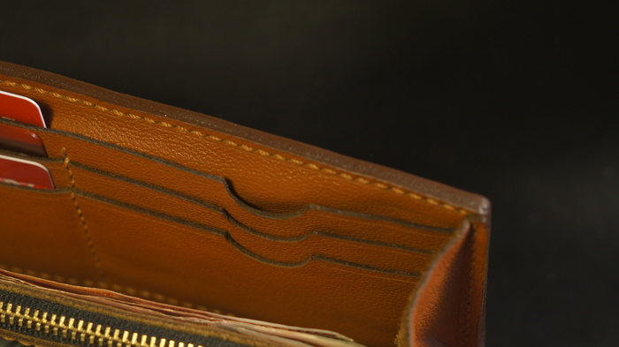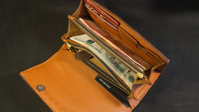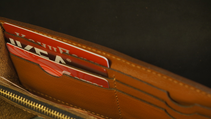 Внутрь пошла шкурка КРС хромового дубления с лицевым покрытием. Это добротная, износостойкая кожа, не требующего особого ухода. Выполнены 12 кармашков для пластиковых карт и два отделения на молнии под монеты/ключи. Всё пришито к полноразмерному подкладу.
