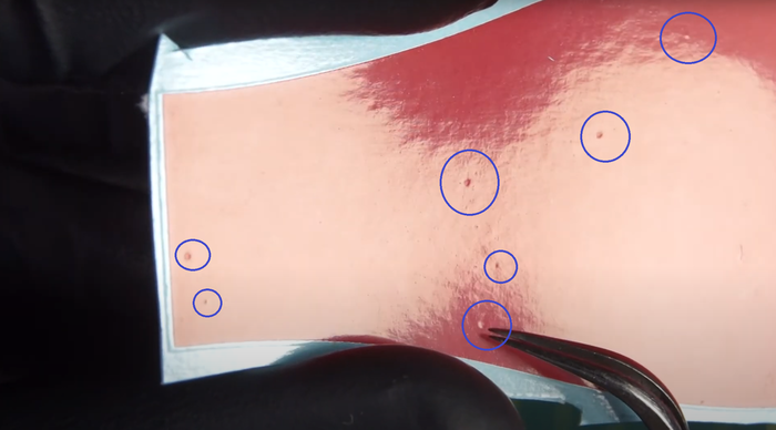 Эта надпись усеяна красными точками, которые находятся на клеевой стороне подложки.