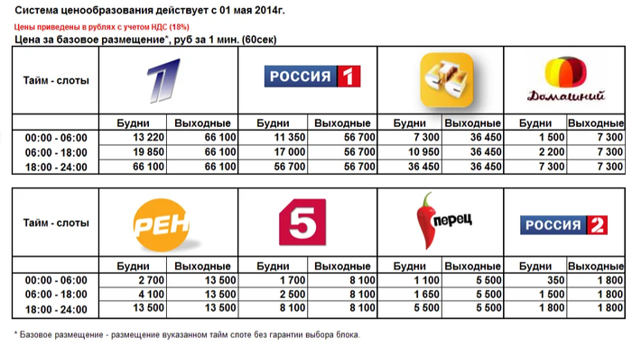 Желающие могут поинтересоваться стоимостью минуты трансляции. Чтобы далеко не ходить ниже я предлагаю вам один скрин цен на трансляцию роликов на наиболее популярных каналах (не на всех). Больше прайсов вы можете увидеть здесь. Я попросту сделал запрос в Яндекс "сколько стоит минута трансляции рекламы на тв"...