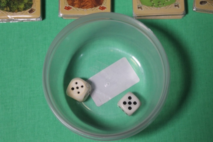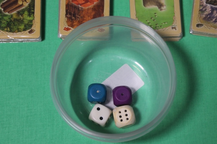 Причем, помните я говорил про числа 2 цветов? 8 и 6 отмечены красным цветом - типа они выпадают чаще всех и ставить поселения на них лучше всего. Так вот — вранье! В этой игре ТерВер не действует! Ну или кажется, что не действует… Ну в общем дело в любом случае не чисто! У нас в игровой ячейке даже поверье с незапамятных времен есть - дескать, сочетание разных кубиков дает разные числа при броске. Так и играем четырьмя кубиками, периодически их меняя, раз в 3-4 круга :)