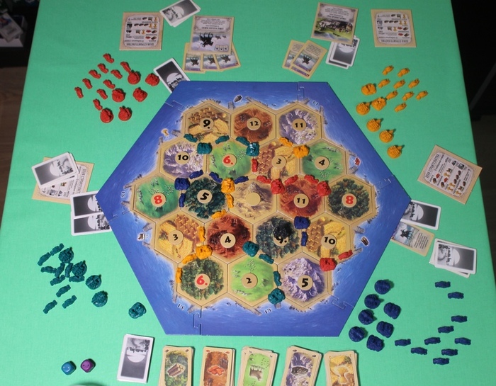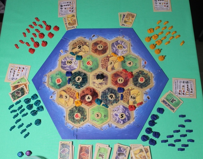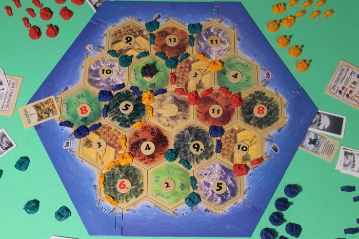 Удачно кидая кубики, удачно торгуя, удачно покупая карты развития и удачно не попадая под раздачу при бросках 7, можно даже развиваться и набирать победные очки...