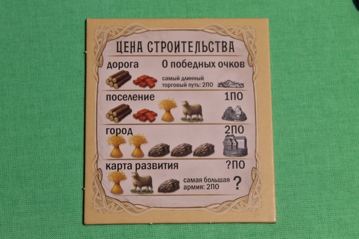 Все вместе это символизирует наш остров Катан. Именно его мы должны будем колонизировать, строя на нем дороги, поселения и города. А! И покупая карты развития! Куда же без них? Все это так или иначе приносит победные очки. За поселение мы получаем 1 ПО, за город — 2. Ну и в колоде карт развития можно отыскать аж 5 карт, которые дают по одному победному очку.