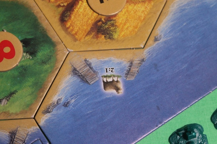 В начале игры перед игроками располагается шестиугольное поле, разделенное на более мелкие шестиугольники — гексы. Причем гексы бывают 6 видов — леса, поля, пастбища, горы, глиняные холмы и 1 гекс пустыни. На каждом гексе лежит еще загадочное число от 2 до 12 (кроме 7) черного или красного цвета. По краям же в виде рамки располагается море и какие-то пирсы…