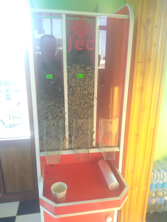 Очень популярны в Узбекистане и семечки. Здесь я впервые увидел автомат по продаже жаренных семечек и сфотографировал его. Вставил мелкую купюру, получил порцию в стакан, оторвал пакетик и пересыпал семечки.