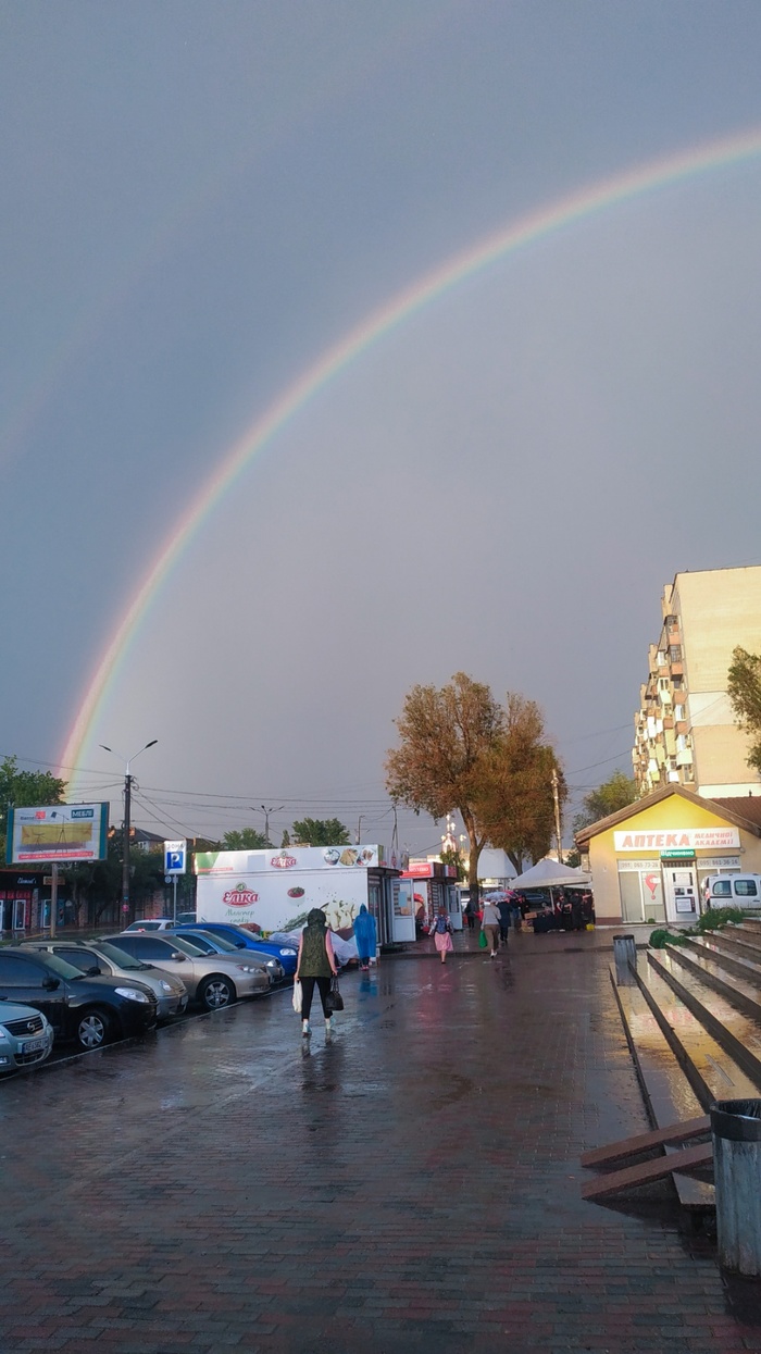 Вчера вечером погода менялась очень быстро. Солнце, тучи, дождь, снова солнце. А потом была радуга. Такую я видела, наверное, первый раз в жизни. Мои фотографии не передадут этой красоты и настроения восторга. Да и место съёмки, да ещё под дождём не добавило качества.