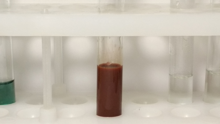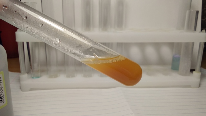 На сей раз заснять все было просто, после баньки светло-желтый р-р помрачнел и стал как будто более ядреным, а цвет его сменился на бурый. При попытке описать итоги опыта пред нами встал следующий вопрос: а не появился ли этот окрас в результате образования золя гидроксида железа (III)? Если вы когда-то изучали основы физической коллоидной химии или, как ее ласково зовут студенты, "физколды", то вы наверняка помните раздел о золях и условиях их существования. Может быть, вы даже проводили опыт с нагреванием на водяной бане р-ра хлорида железа (III), где вы должны были наблюдать аналогичное помутнение. Там молекулы хлорида железа (III) в водном растворе подвергаются частичному или полному гидролизу с гидроксидом на выходе. Не будем вдаваться в подробности и объяснять природу мицелл, но суть вам ясна. Что говорят фармакопеи? По их словам, р-р должен стать чуть красноватым, а точнее, цвет должен стать тёмно-оранжевым. Мы этого фактически добились, а вот в случае с золем этого бы мы не заметили, там окрас мало бы чем отличался от исходного.