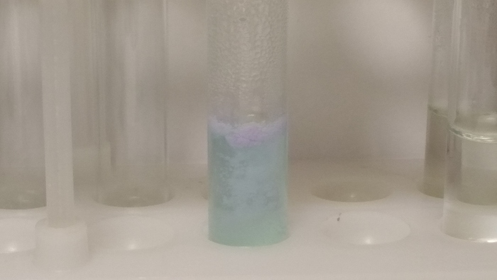 Смело ставим р-р над огнем и ждем чего-нибудь интересного. Но реакция так просто не хочет себя обнаруживать, поэтому вы можете довести р-р до кипения, но может ничего не произойти. Но если внимательно присматриваться, то концу взаимодействия вы увидите странные частицы у поверхности р-ра. Дайте смеси чутка остыть, и сможете увидеть искомое соединение. Оно представляет собой сиреневые хлопья, обычно локализующиеся сверху. Их всегда образуется очень немного, так что отфильтровать, высушить и досконально изучить пока не представляется возможным. Однако именно так выглядит первая реакция, доказывающая подлинность хлоргексидина.