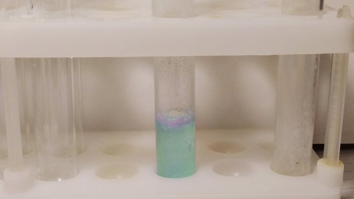 В качестве первого взаимодействия предлагается познакомить препарат с сульфатом меди. Однако вследствие сильного разведения ЛВ в растворе нужно брать всего несколько капель купороса, иначе эффект реакции заметно ослабевает. Повторяем первый шаг и наблюдаем такую картину: р-р препарата хоть и ожидаемо окрашивается в голубой, но вскоре наш глаз замечает, что он не просто голубой, но еще и мутный. Действительно, сульфат меди провоцирует помутнение р-ра, но природу явления пока объяснить не удается.