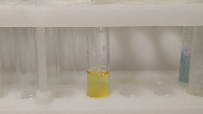 После всех предыдущих реакций возникло странное ощущение, что здесь что-то не так. Все р-ры в той или иной степени мутнели, а при проверке выяснилось, что все добавленные к ним ранее соли имели кислую среду при гидролизе. С иодом в той же кислоте случилось нечто похожее. Значит, надо обратить внимание на низкий рН. Добавим-ка просто серки: