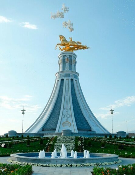 "Всегда на коне". Эту архитектурную композицию можно было бы назвать еще и так. Или, скажем, "Верные друзья". Под ним грациозно гарцующий ахалтекинец, рядом застывший в полете голубь мира. И он – как гордый часовой, один во всей Вселенной в национальной одежде и с высоко поднятой правой рукой. Это – "Монумент Аркадаг", что значит "основа", "покровитель".