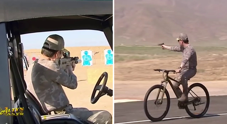Президент Туркменистана не устает демонстрировать свои спортивные достижения. На этот раз Гурбангулы Бердымухамедов принял участие в военных учениях, во время которых расстрелял мишени, проезжая мимо на велосипеде. Ну, просто универсальный солдат!