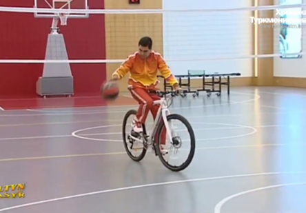 Президент Туркмении Гурбангулы Бердымухамедов стал основателем нового вида спорта – он научился попадать в кольцо, сидя на велосипеде. Команду он пока только собирает, но, к счастью, его приспешники еще не тянут – у человечества есть время тоже подготовиться. Вот такой вот занятой, что решает и такие проблемы страны.