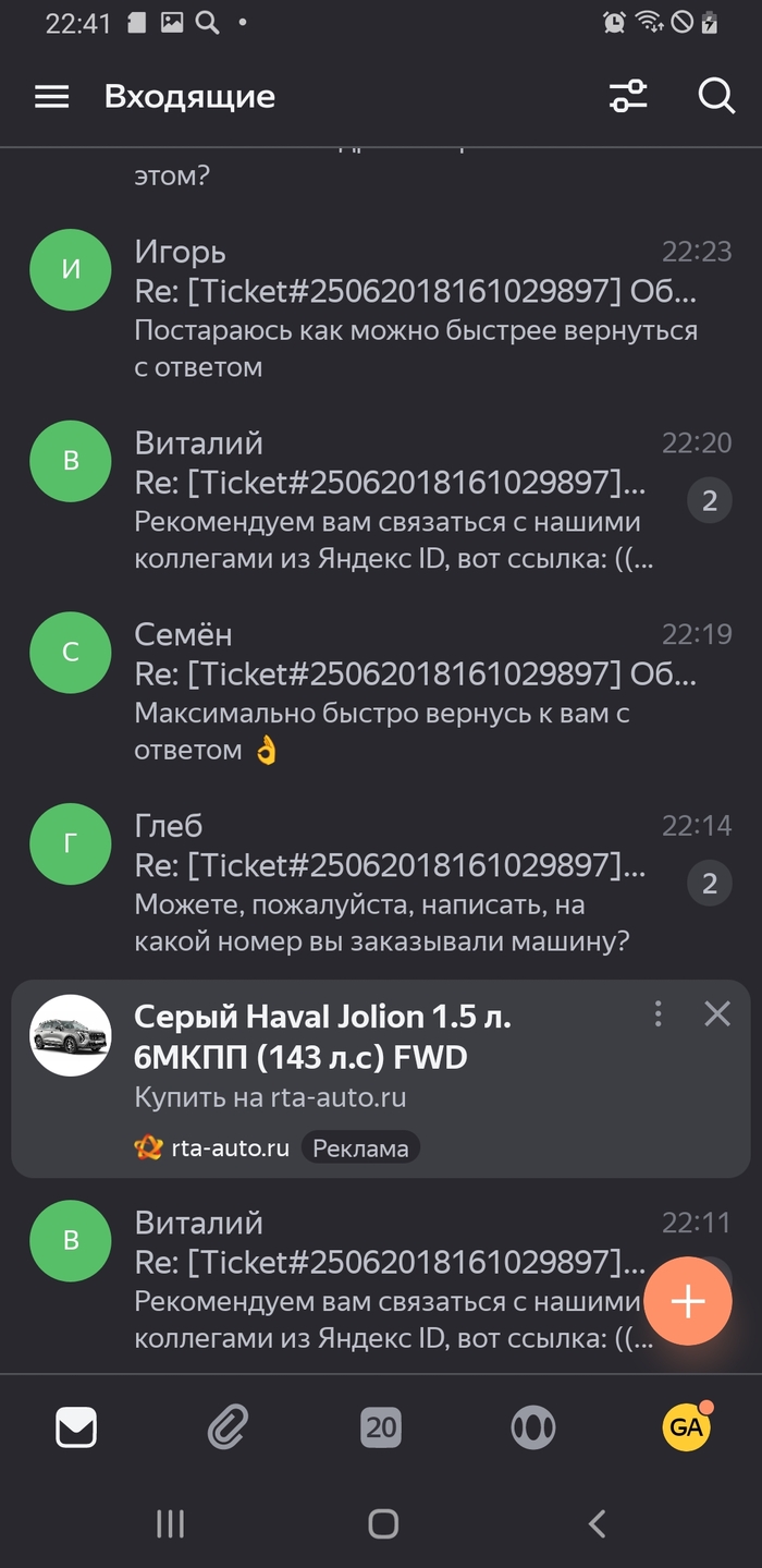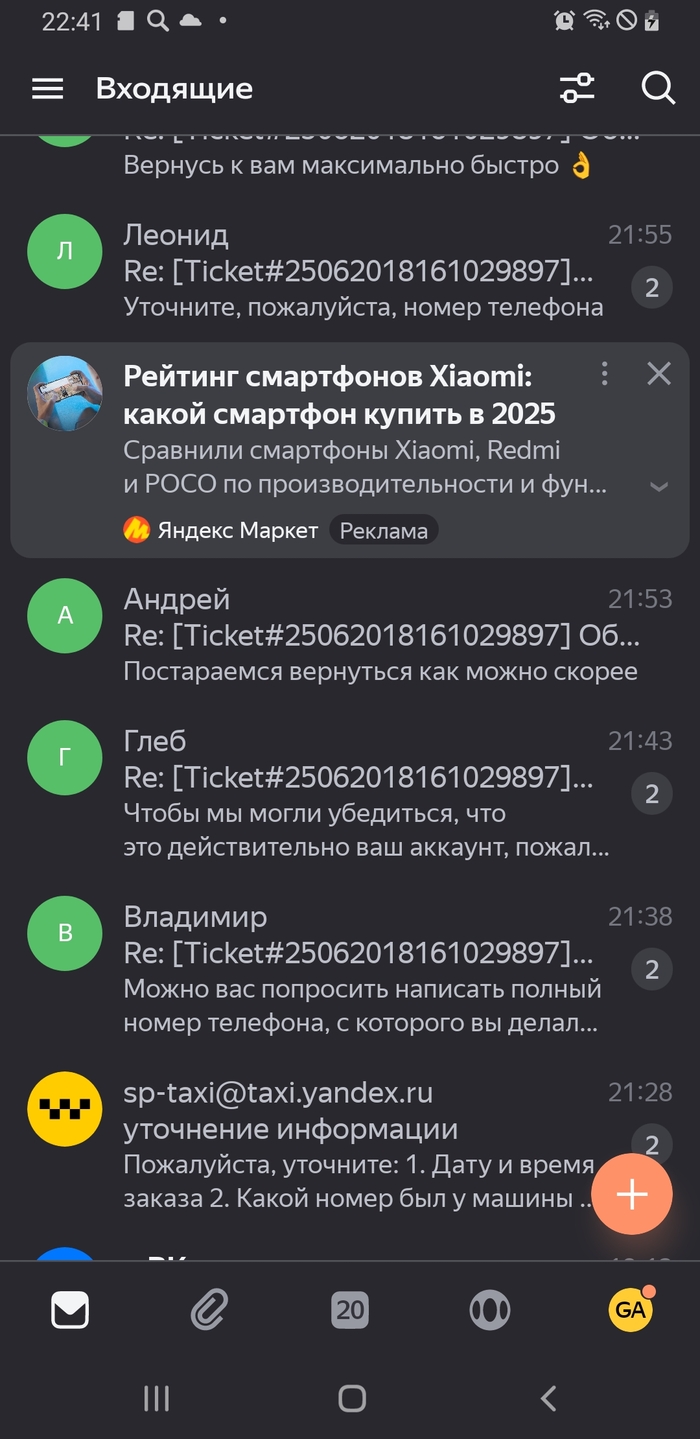 В общем мокро ливень, я мокрый, техника мокрая, добиваюсь куда надо чертыхаясь, говно кипит, думаю ну ух я щас в поддержку напишу. На скрин выше мне отвечают, что это частая проблема, можете позвонить в поддержку, в часте прошу передать, что звонить не желаю, прошу передать сообщение коллегам (по ходу мудилам ещё больше чем водила) мне в ответ на почту эти поддержанты начинают писать с вопросами, с какого номера и аккаунта я вызывал такси, присылаю номер привязанный к аккаунту, они просят привязать к аккаунту номера почту. Шлю скрины, что номер и почта в одном аккаунте. В ответ мне предлагают обратится к в яндекс id. А теперь лёгкий скрин писем