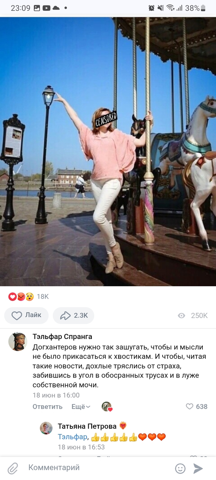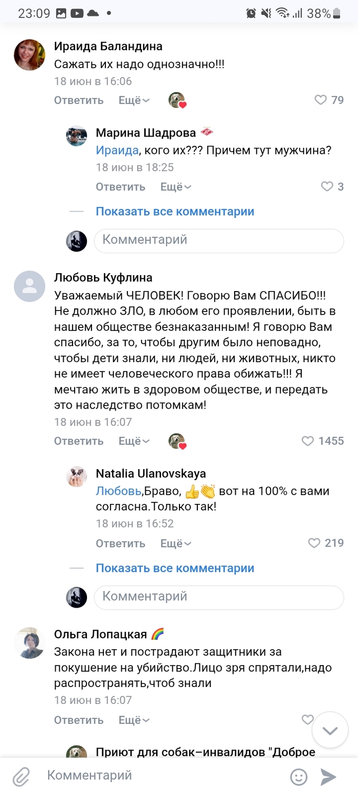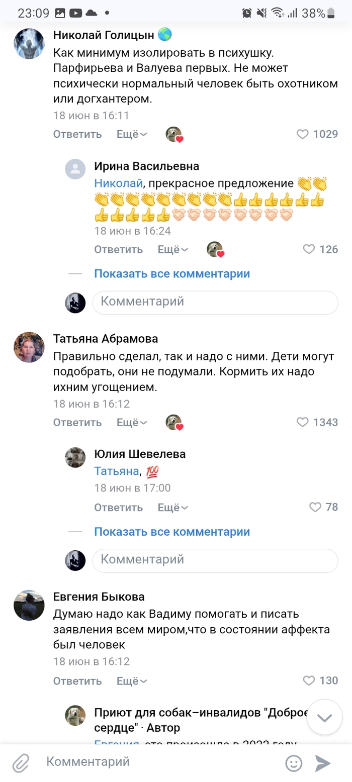 В ВК прям рассвет общественной зоошизы. Пусть действия и нельзя назвать гуммаными от слова совсем, но зоозащитник выбил меня из колеи, собственно как и многочимленные комментаторы. Пост набрал свыше четверти миллионов просмотров и пускай хоть четверть из них - настоящие люди, меня пугает тот факт что большинство людей поддерживают и защищают мужчину, а сочувствующих девушке сразу гнобят и свячески травят...