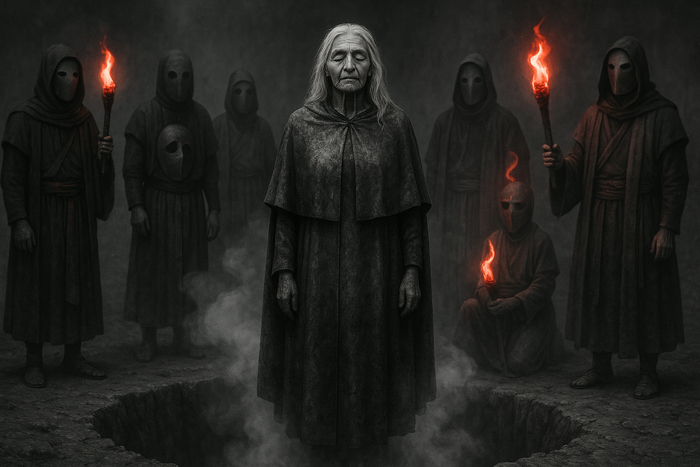 Рецитатор кивнул и поведал, как, блуждая после потопа, нашёл бездну и спустился к древним вратам, отмеченным знаками, старше пророчества о Десяти Ядах Селур. За ними был зал, освещённый красными факелами. В центре лежал Акалос, Провидец Огня, его тело, искусно забальзамированное, не тлело. Вокруг стояли тысячи запечатанных капс, обсидиановых и кристальных, каждая тихо гудела.
