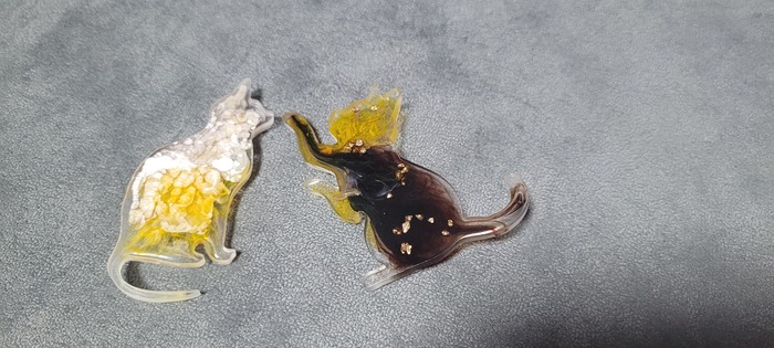 Сделала контрольные замеры - без какого-либо наполнителя в изделиях остаток не более 15г, если заливка посложнее и декора больше - тут как повезёт, до 50г доходит. Обычно стараюсь сделать замес поменьше, но бывают промахи.