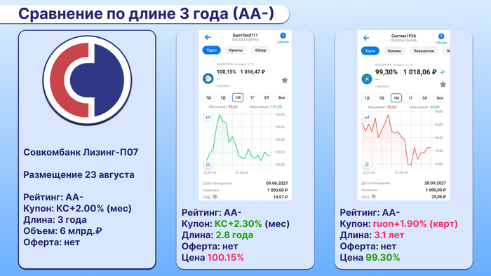 20 августа прошел сбор заявок на облигации «Совкомбанк Лизинг», финальный спред к ключевой ставке зафиксировали на 200 б. п. В этом диапазоне довольно много флоатеров, рассмотрим два с одинаковым рейтингом и схожими параметрами.
