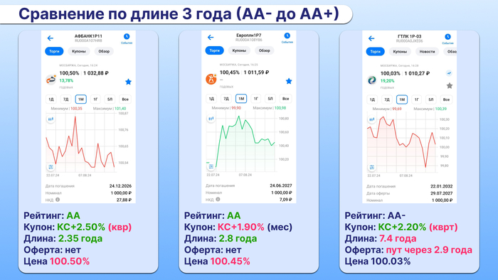 Высокий рейтинг с повышенной премией, комфортная длина выпуска. Из минусов — тот же квартальный купон и недоступность цены у номинала.