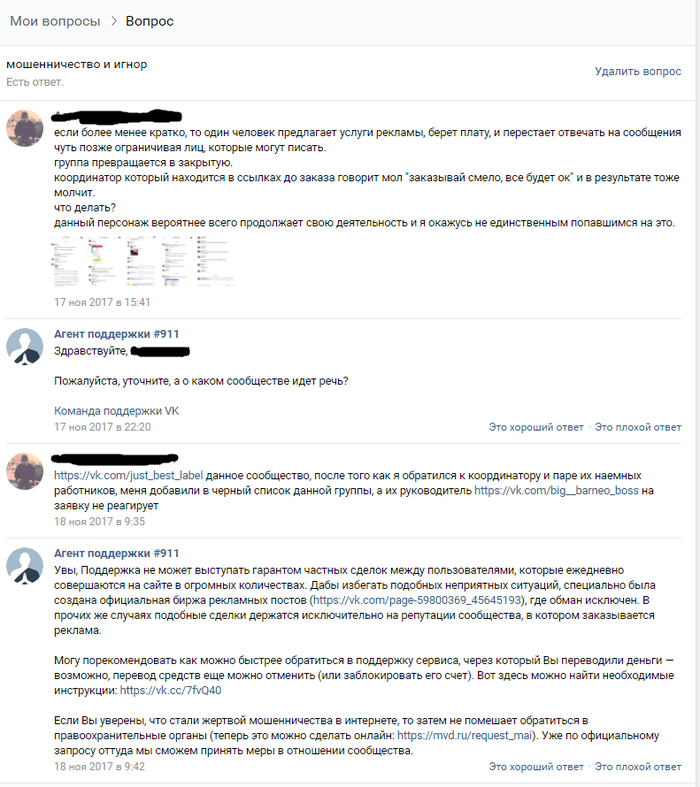 Поддержка вк меня совсем удивила. Я в принципе согласен, что они не несут ответственности за такие сделки, я не прошу их возвращать мне деньги и тд, но так как они совсем ничего не предпринимают, страницы мошенников активны и они, вероятнее всего разводят других людей, что весьма печально.