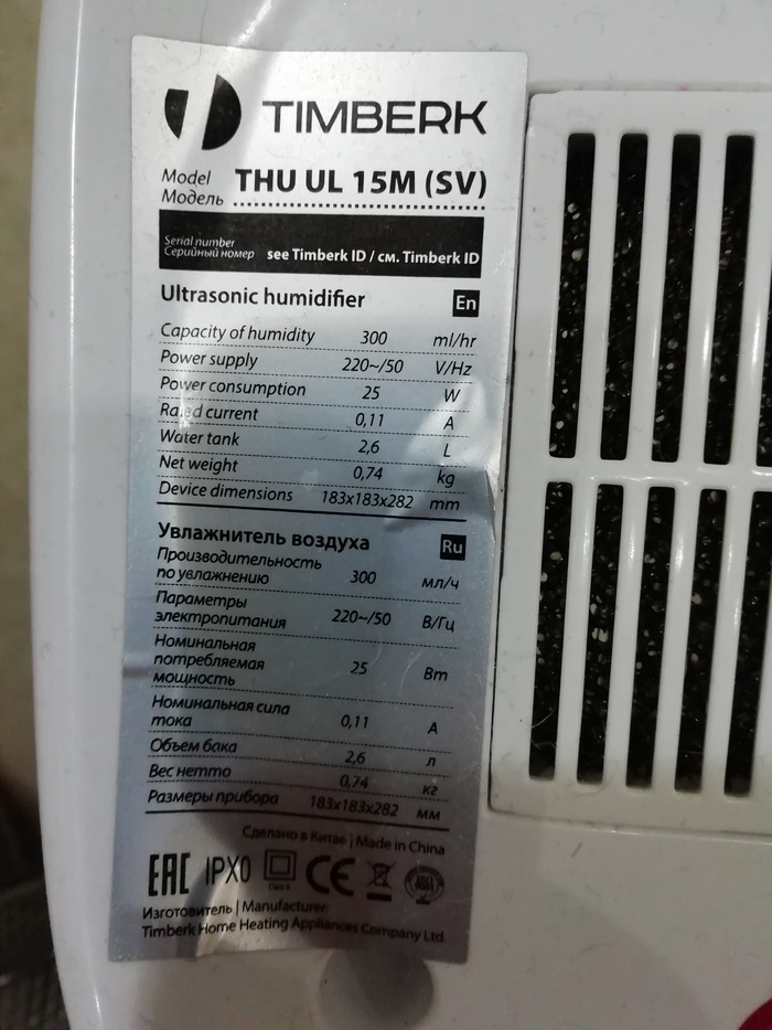 Имеется увлажнитель воздуха TIMBERK, модель THU-UL-15M.