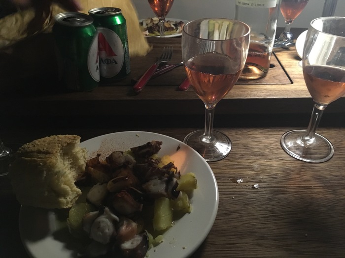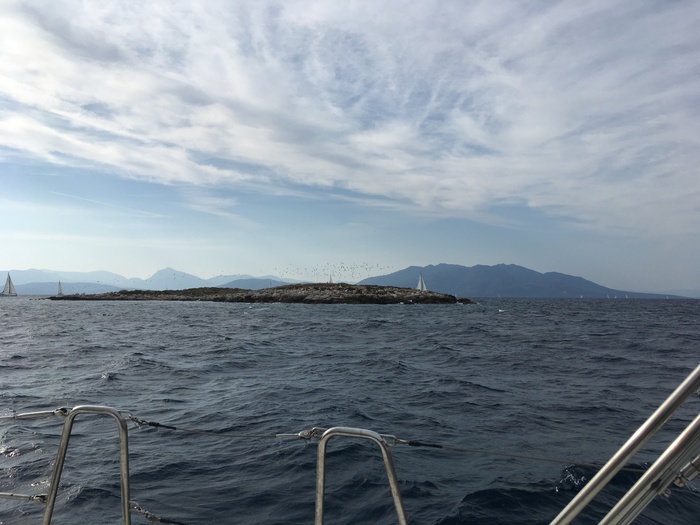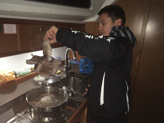 Павел идет вниз, и начинает готовить осьминогов, которых купили утром. Посмотрел по времени - это около 20 часов. Остальной экипаж на палубе, совершаем маневры, чтобы выйти на финишный участок. Наконец слышим голос организаторов в рации - нам сообщают что мы находимся рядом с финишной прямой, и подсвечивают буи, между которых нам нужно пройти, чтобы завершить дистанцию. Что мы успешно и выполняем. Слышим по рации сообщение о подтверждении, и отправляемся в марину на швартовку. Да, не написал - наш сегодняшний финиш на острове Порос.
