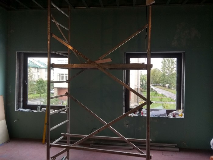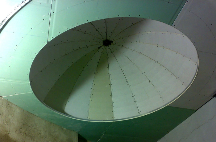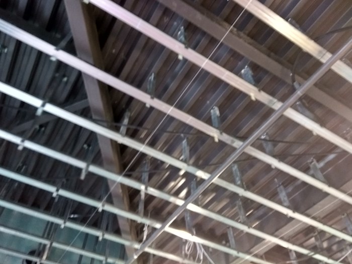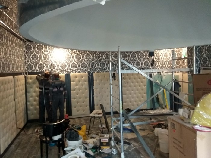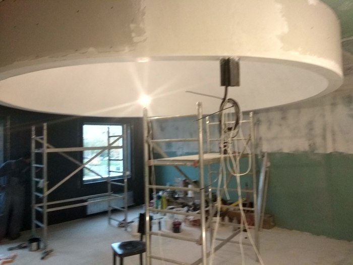 купол все таки вписали и стройка пошла полным ходо. На виброподвесах повесили первый слой потолка для монтажа звукоизоляции