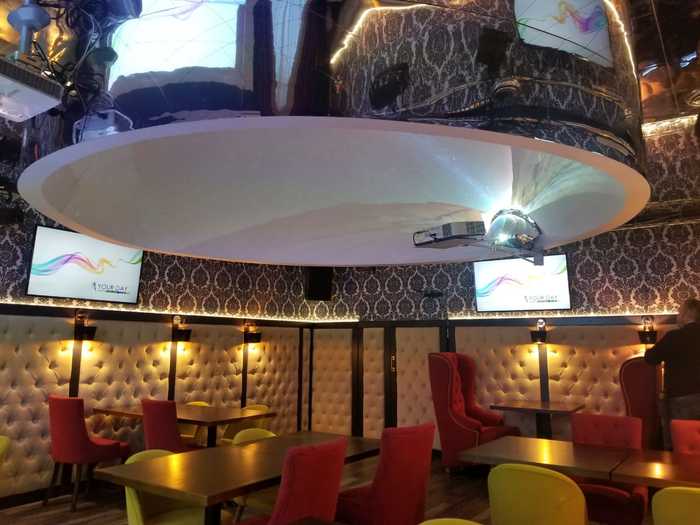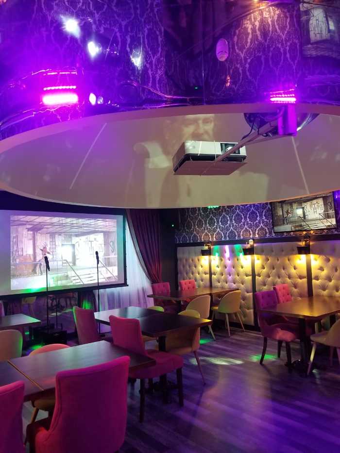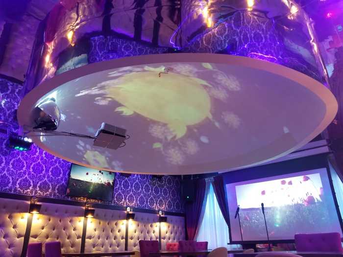 По технике, изначально предполагался Electrovoice zlx15 - люблю я эту фирму, но в итоге согласовали Mackie srm550 чтобы сэкономить. Повесил я их по углам на цепях и направил с наклоном вниз к центру зала. Пульт взял цифру behringer xr16, удобно управлять с планшета/смартфона/компа. Микрофоны Sennheizer. Проекторы ради эксперимента взял лазерные, 5000 люмен, Sony на купол, и Optoma ультракороткофокусный на экран караоке (там расстояние всего 80 см) очень доволен, 20000 часов наработки лампы это лучше чем 2 тыс. стандартного проектора. а цена сопоставима. С Сонькой лазерной был уже знаком, делал по братски хорошему человеку домашний кинотеатр в коттедже. Проектор - огонь.