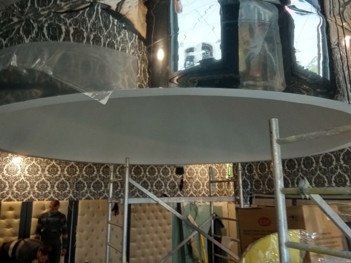 Планируемую на потолке мозаику решили сделать из пластикового зеркала, чтобы уменьшить нагрузку на потолок и упростить (убыстрить монтаж). так же обтянули внешний цилиндр купола