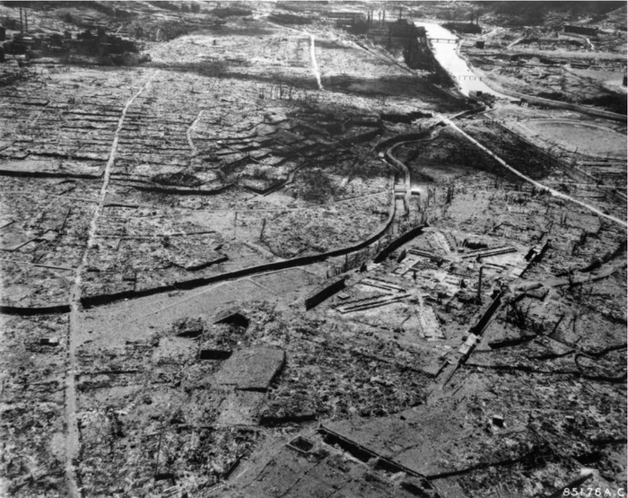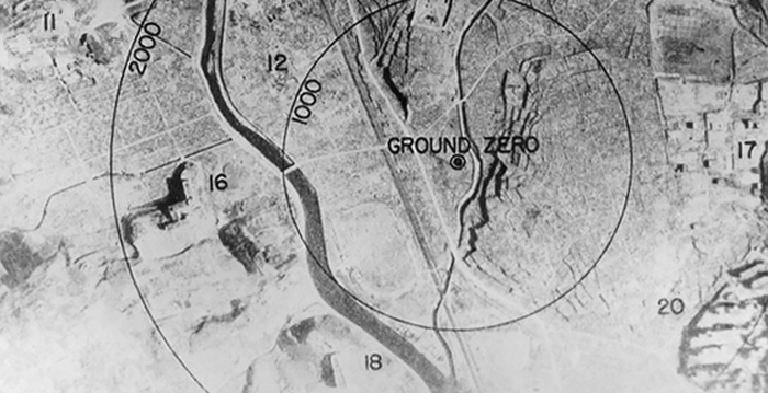 Над Нагасаки тоже была облачность, но менее сильная, фото съёмки не мешающая, потому, после предварительного прицеливания бомба ("Толстяк") из обогащённого плутония, которая была вдвое мощнее бомбы взорванной над Хиросимой, была сброшена над нулевой отметкой видимой на фото ниже=
