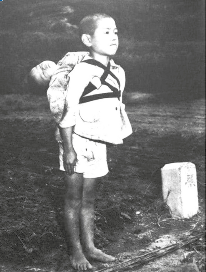 Мальчик стоит в очереди на кремирование своего младшего брата. Фотография сделана на следующий день, после ядерной бомбардировки. г. Нагасаки