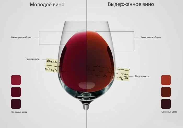 Если посмотреть на кромку бокала, молодые красные вина будут преимущественно пурпурно-красного цвета, а в выдержанных винах будут присутствовать луковичные и коричневые оттенки.