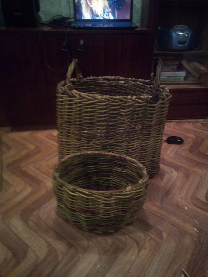 А вот и готовое изделие!!!! Для сравнения на её фоне маленькая недоплетёная корзинка объёмом почти с ведро)))