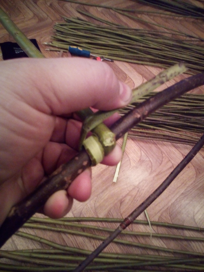 Притащили? Тогда продолжаем! Берём прутья, которые потолще и срезаем вдоль снизу, чтобы срез можно было два раза обмотать вокруг овала основы и остался хвостик. Овал размечаем на небольшие равные отрезки, желательно на чётное количество