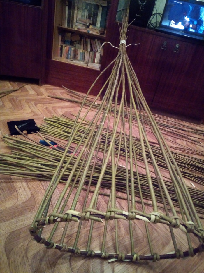 Начинаем плестЬ!!!))) Выбираем из общей кучи для плетения прутья примерно одинаковой длинны и толщины. Их количество должно равняться количеству стоек на овале. Затачиваем каждый низ прута под углом чуть острее 45 градусов. Укладываем прутья в основу вигвама поштучно. Каждый прут фиксируется между тремя стойками. Последующий прут фиксирует предыдущий накладываясь сверху. Прутья должны лежать срезаным концом внутрь корзины.
