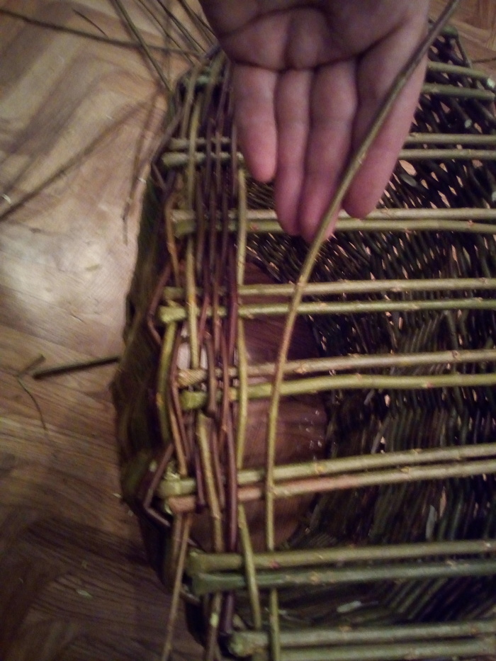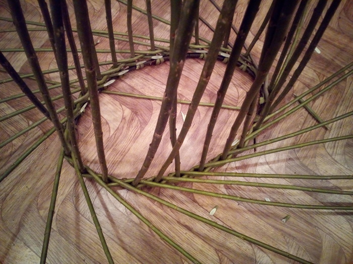 Теперь не спеша по одному прутику вплетаем обрешётку дна.